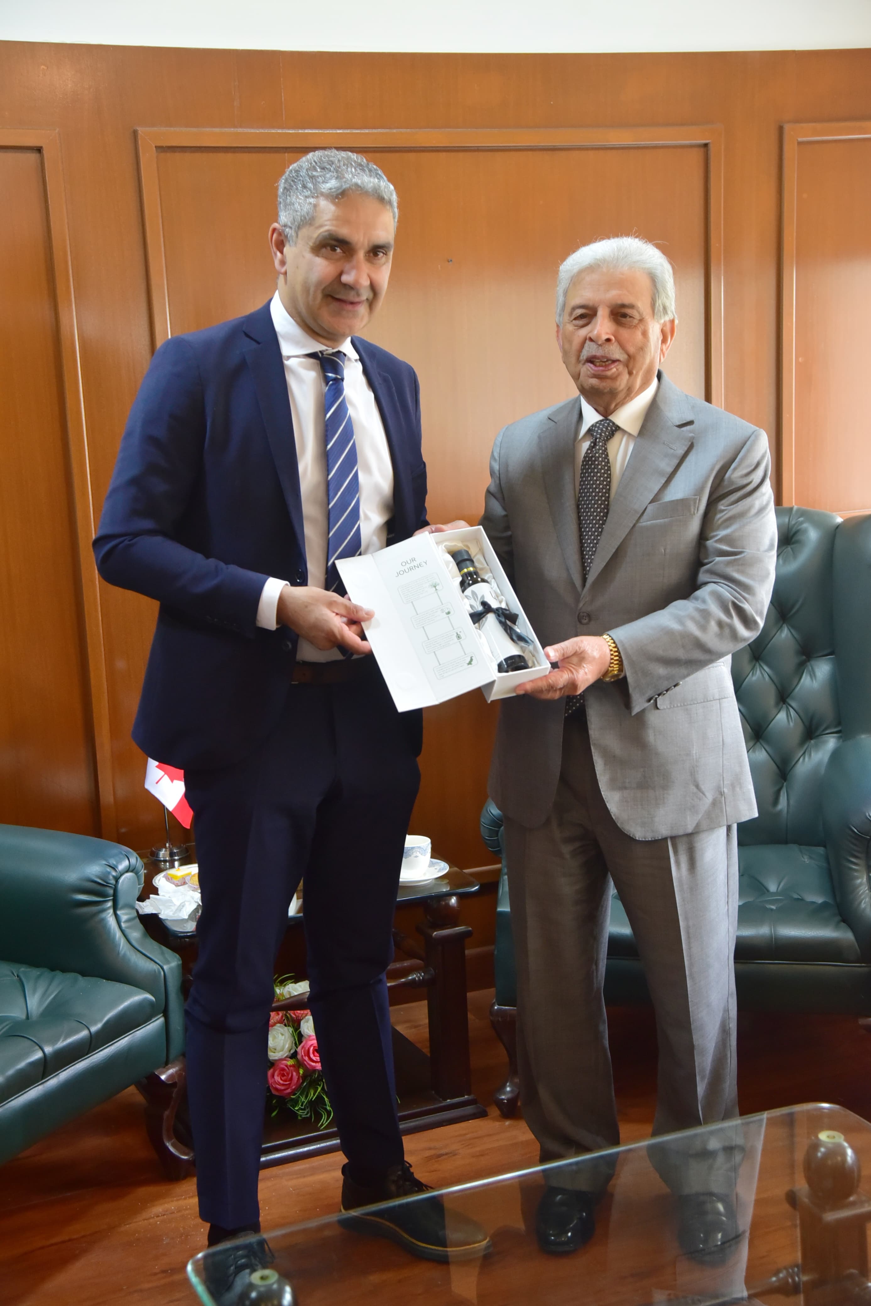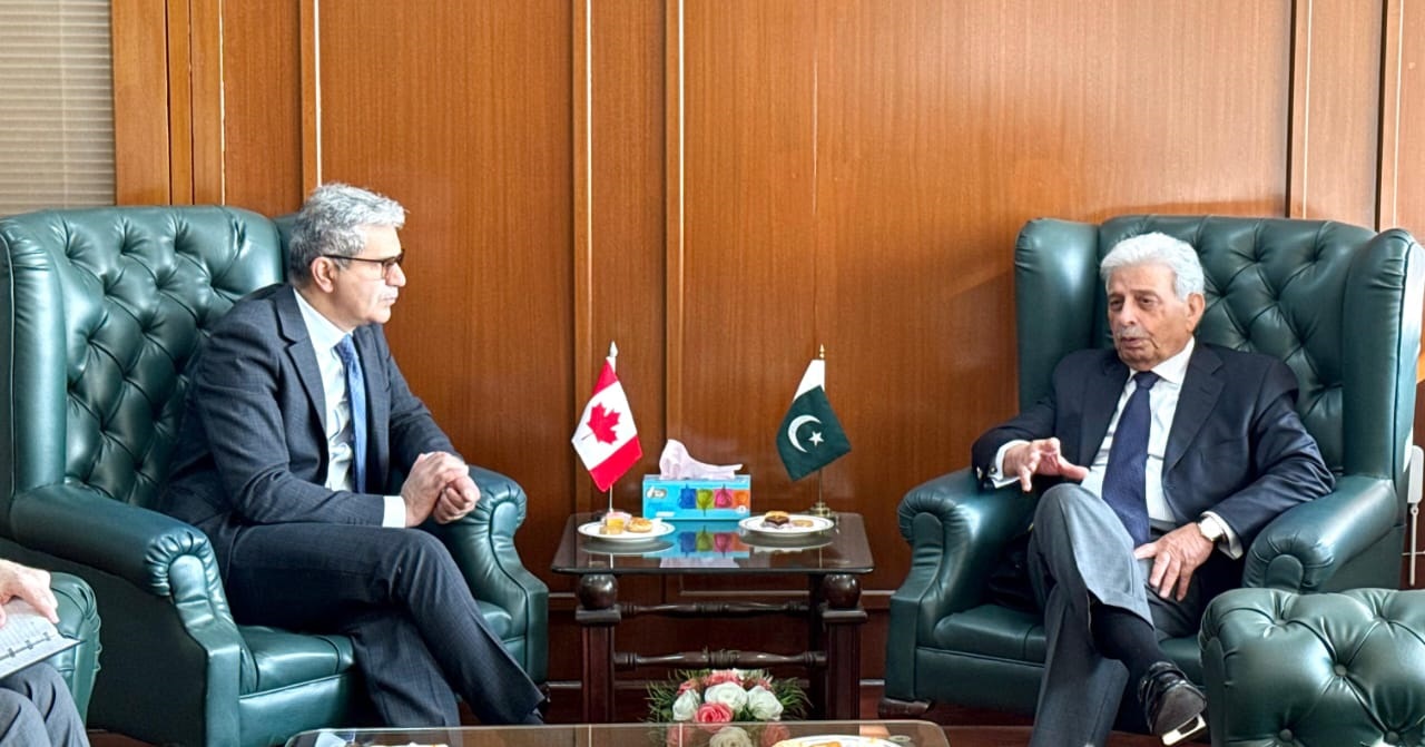 Federal Minister for National Food Security and Research Rana Tanveer Hussain meeting with Canadian High Commissioner Tariq Ali Khan to discuss enhancement of bilateral agricultural cooperation and sustainable agri-trade, Islamabad, October 28, 2025.