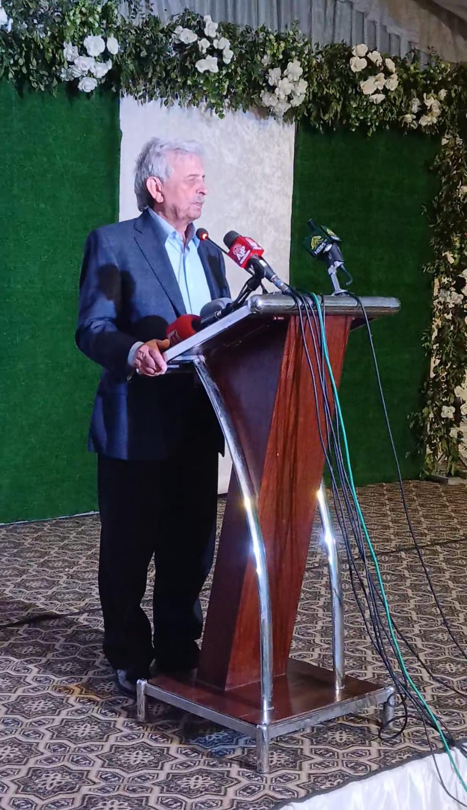 Federal Minister Rana Tanveer Hussain addressing the media on the Indian attack and the government's efforts for the reconstruction of Jamia Umm Al-Qura Mosque at Sheikhupura on May 12