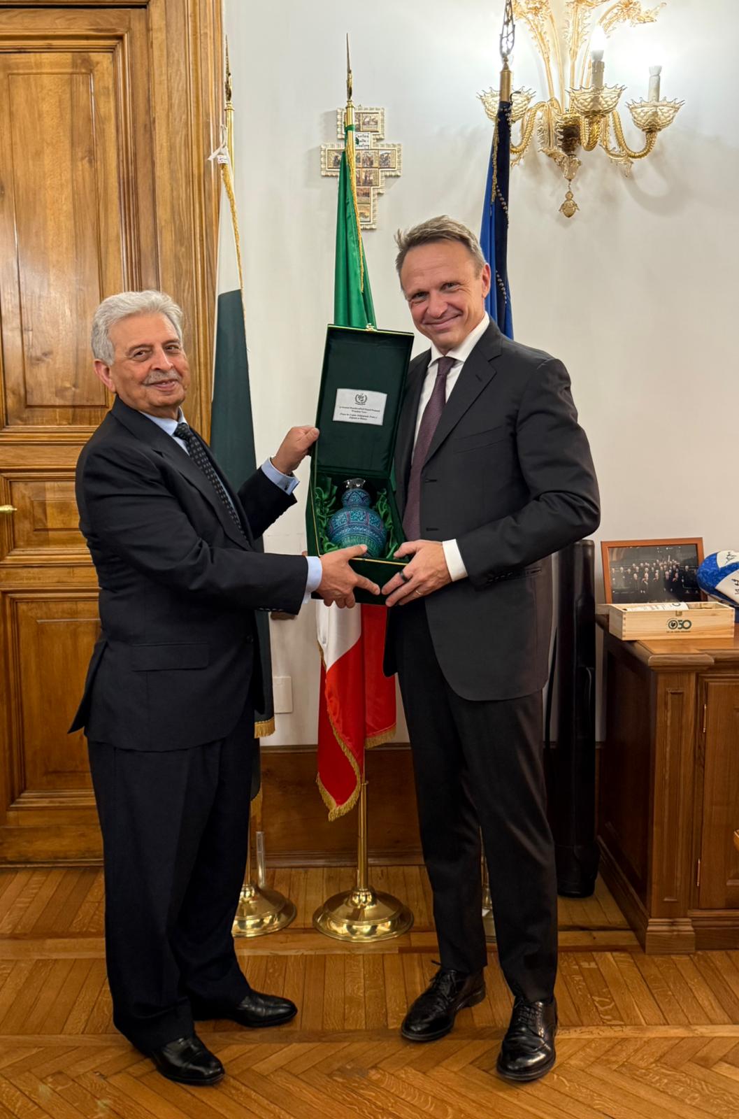 Federal Minister for National Food Security & Research, Rana Tanveer Hussain, meeting Italian Minister of Agriculture, Food Sovereignty and Forestry, Francesco Lollobrigida, in Rome — 4 December 2025.