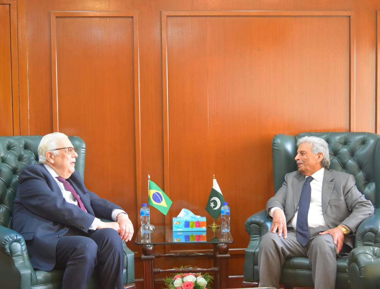 Federal Minister for National Food Security & Research, Mr. Rana Tanveer Hussain, meets with H.E. Mr. Olyntho Vieira, Ambassador of Brazil to Pakistan, to discuss strategic cooperation in livestock, dairy, and meat sectors. Islamabad – 23rd December 2025.