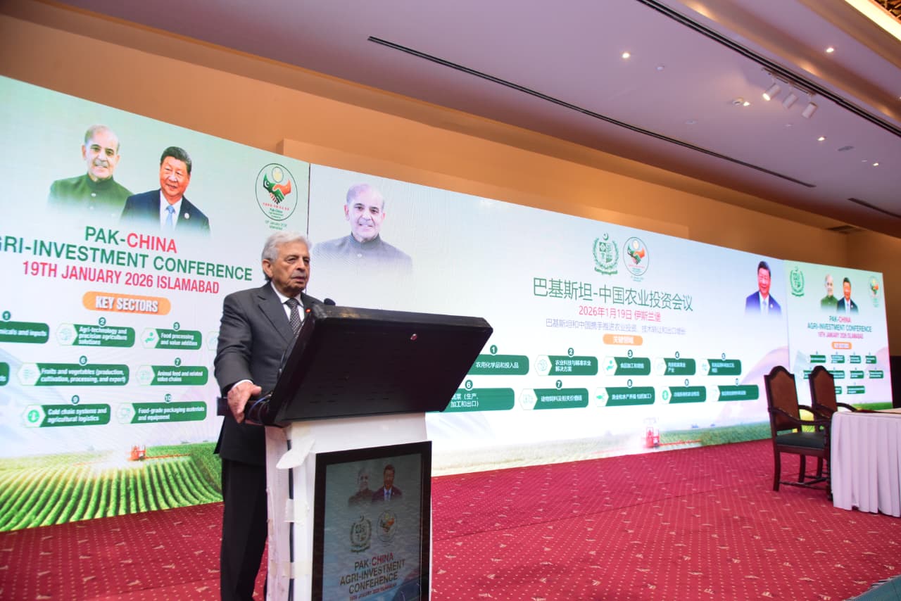 Federal Minister for National Food Security and Research Rana Tanveer Hussain addressing the Pakistan–China Investment Conference in Islamabad, reaffirming Pakistan’s commitment to facilitating Chinese investment in agriculture and food security sectors. (January 19, 2026)