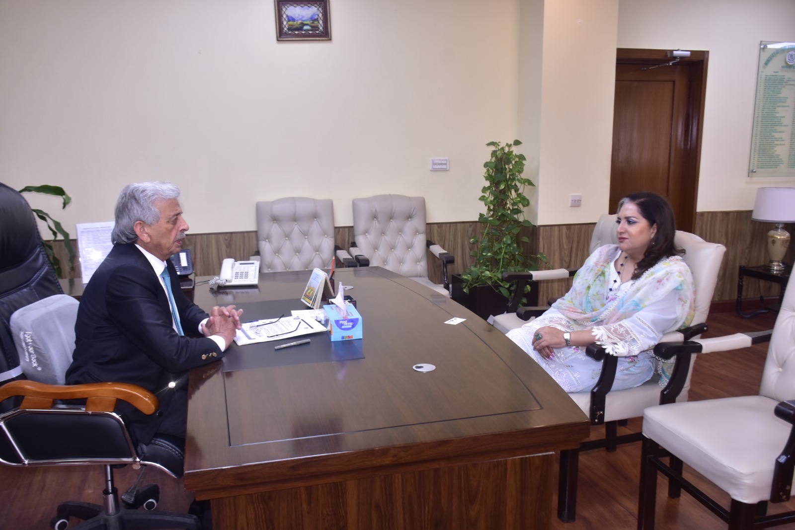 Federal Minister for National Food Security and Research, Mr. Rana Tanveer Hussain, in a meeting with FAO Representative to Pakistan, Ms. Florence Rolle, to discuss strengthening cooperation in agriculture and addressing climate challenges.