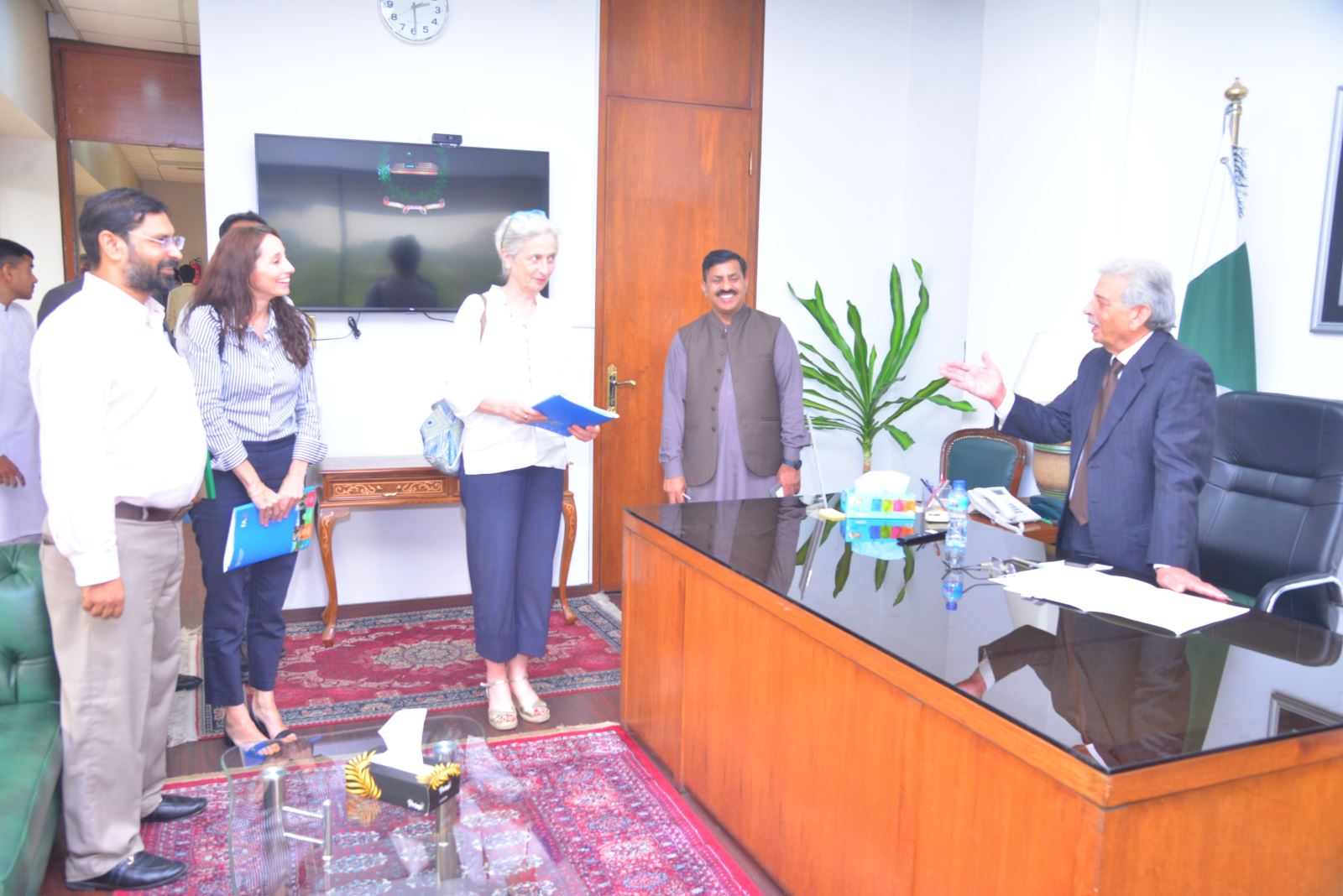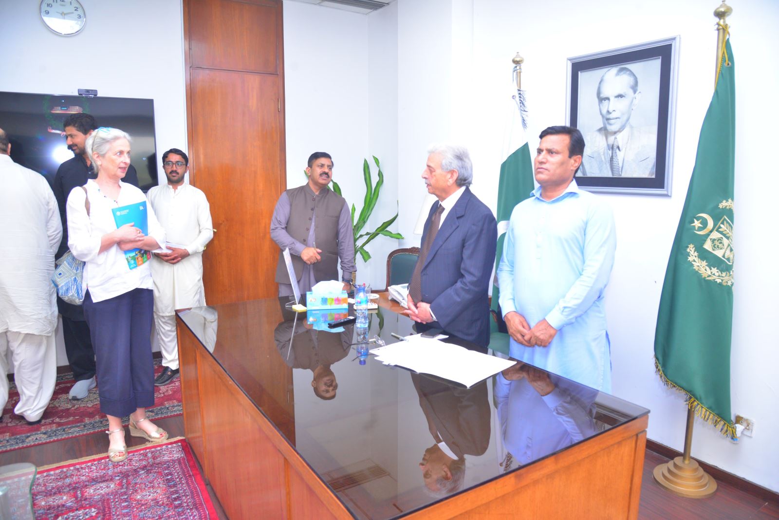 Federal Minister for National Food Security and Research, Mr. Rana Tanveer Hussain, in a meeting with FAO Representative to Pakistan, Ms. Florence Rolle, to discuss strengthening cooperation in agriculture and addressing climate challenges.